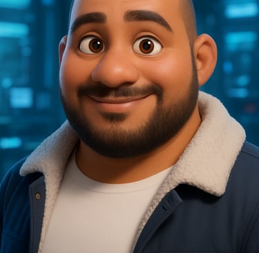 Image of a young man with a beard and black hair wearing a blue t-shirt with the text "California Digital". 3D Pixar cartoon style. In the background, a blurred technological environment.